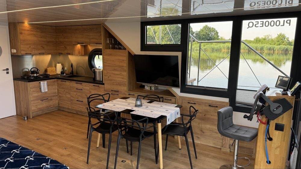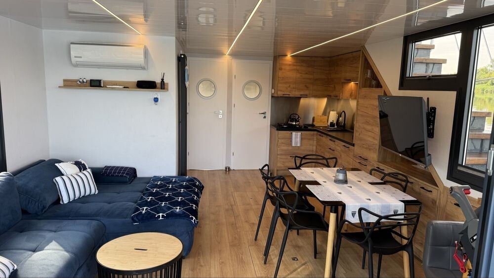 canapé d'angle convertible, 6 chaises, table 6 places + petite table, timonerie, TV, lave-vaisselle intégré, commande d'éclairage,
