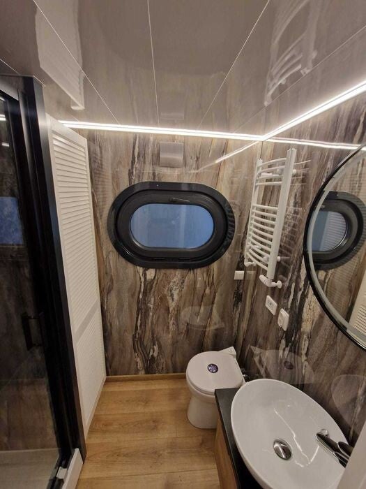 - douche, lavabo, miroir éclairé, toilettes avec broyeur